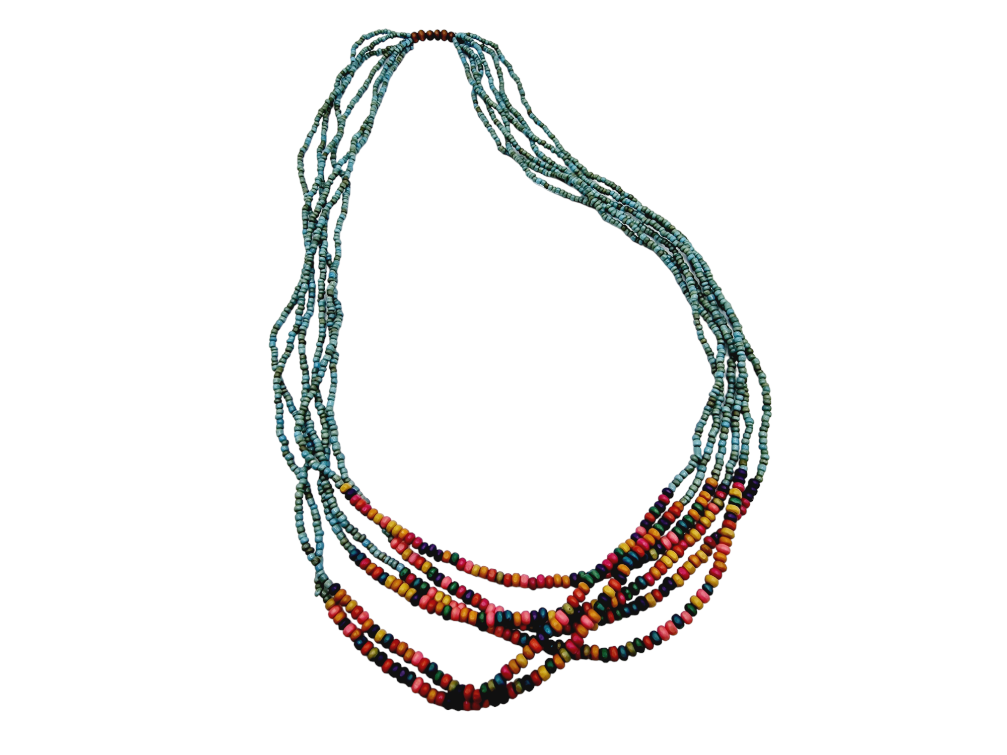 Bohokette mit Mehrfachstrings (12 Stück) aus kleinen Glas- und Holzperlen aufgefädelt, mit beige- oder türkisfarbenen Glasperlen im Vintagelook, der untere Teil der Strings endet mit bunten Holzperlchen.Sehr schmückend auf Leinen- und luftigen Sommerkleidern oder dekorativ auch auf Strickpullis.