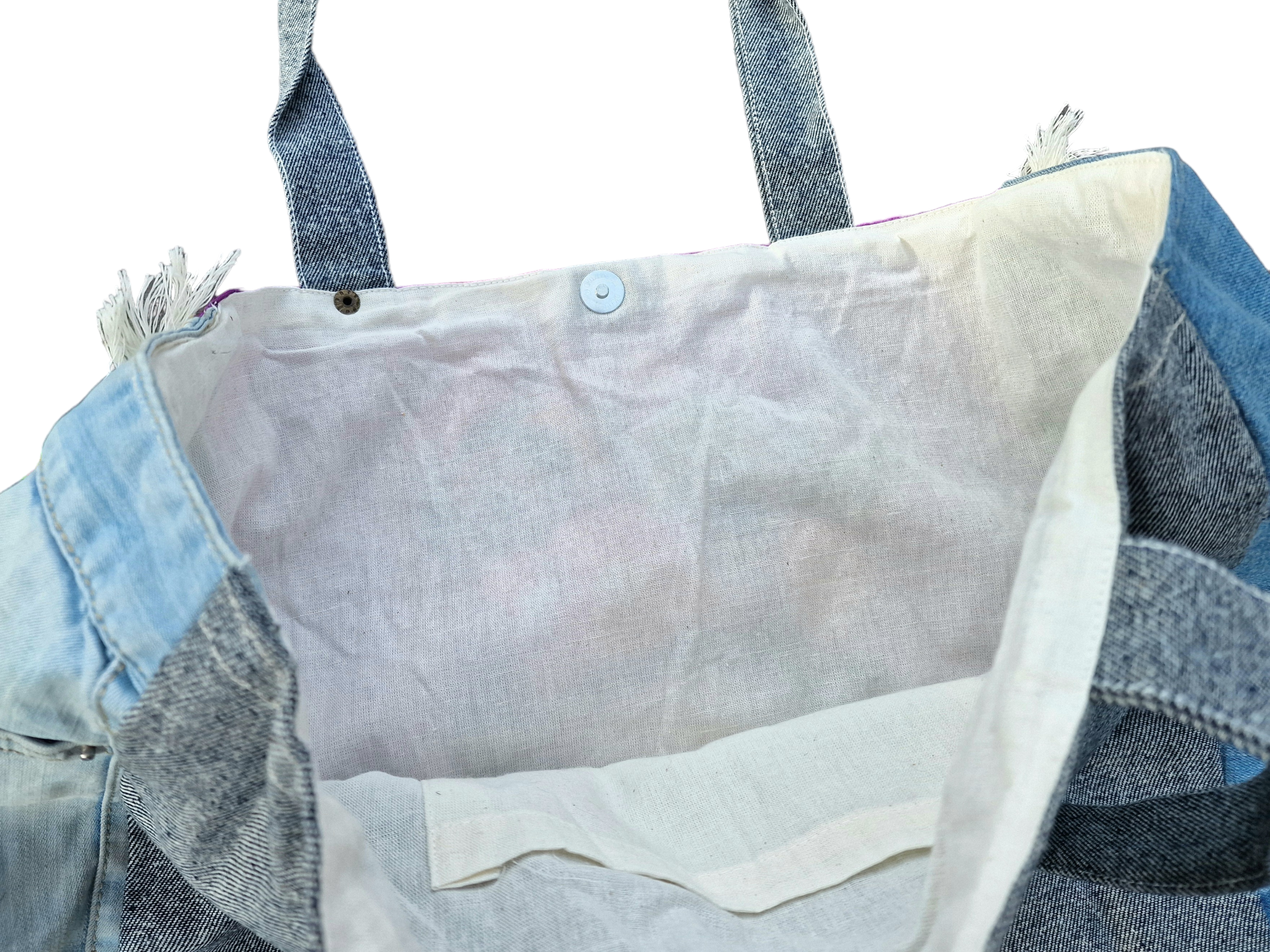 Die Frida Bohotasche ist ein Statement, sie zeigt FRIDA KAHLO, die berühmte Künstlerin und Stilikone. Frida Kahlo trägt den für sie so typischen Blumenschmuck im Haar, den Schmetterlinge umkreisen. Rechts und links sind helle Fransen angenäht. Das Foto ist abwaschbar. Eine Quaste mit bunten Bändern im Bohostyle schmückt zusätztlich die Tasche. Die Rückseite der Tasche ist aus recycletem Jeansstoff genäht. Das Innenfutter ist ein heller Nesselstoff. Es gibt außerdem eine Innentasche und einen Magnetknopf zum Verschließen. In die Tasche passt richtig viel rein. Geeignet zum Shoppen oder als Strandtasche!